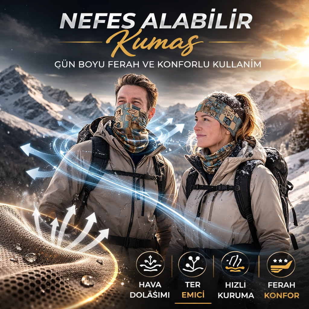 Nefes alabilen mikrofiber kumaşı, ciltte hafif ve ferah bir his oluşturur, terlemeyi minimum seviyede tutar. Yumuşak dokulu ve dikişsiz yapısı yüz ve boyun bölgesine kusursuz uyum sağlayarak uzun süreli kullanımlarda rahatsızlık hissi oluşturmaz. Hızlı kuruyan formu sayesinde yoğun tempolu aktivitelerde ve değişken hava koşullarında pratik kullanım sağlar.