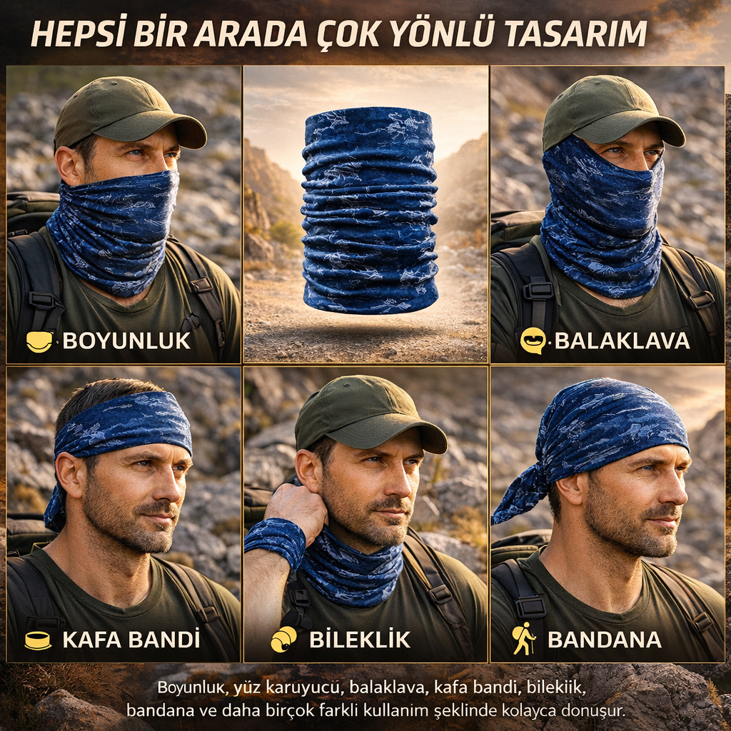 • Kullanım Şekilleri: Boyunluk, bandana, kafa bandı, maske, bileklik
